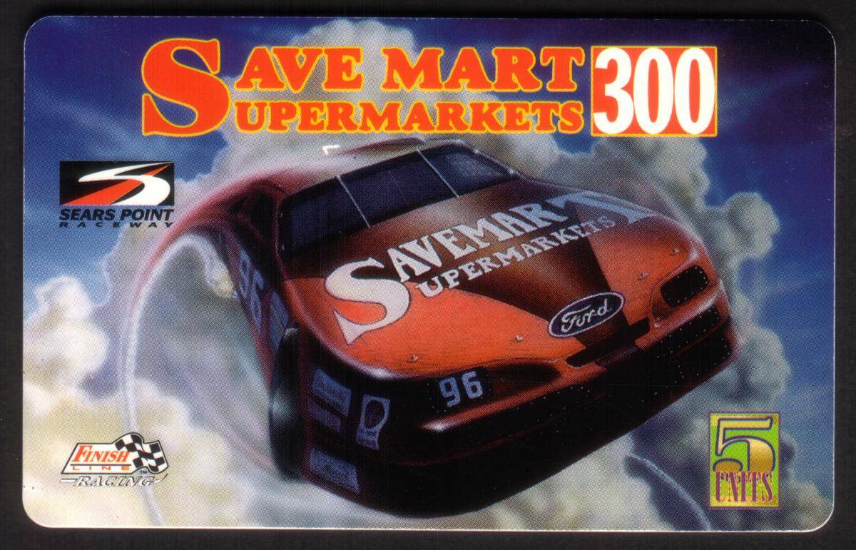 This collectible card features an image centered on NASCAR auto racing. The scene captures a white race car prominently displaying the Save Mart Supermarket logo across its hood and sides. The car is branded with Ford and carries additional corporate trademarks and sponsor logos common to professional stock car racing vehicles. The racing car is positioned in front of the grandstand at Sears Point Raceway, a well-known racetrack. The background includes a crowd-filled grandstand, adding to the authentic racing atmosphere.
