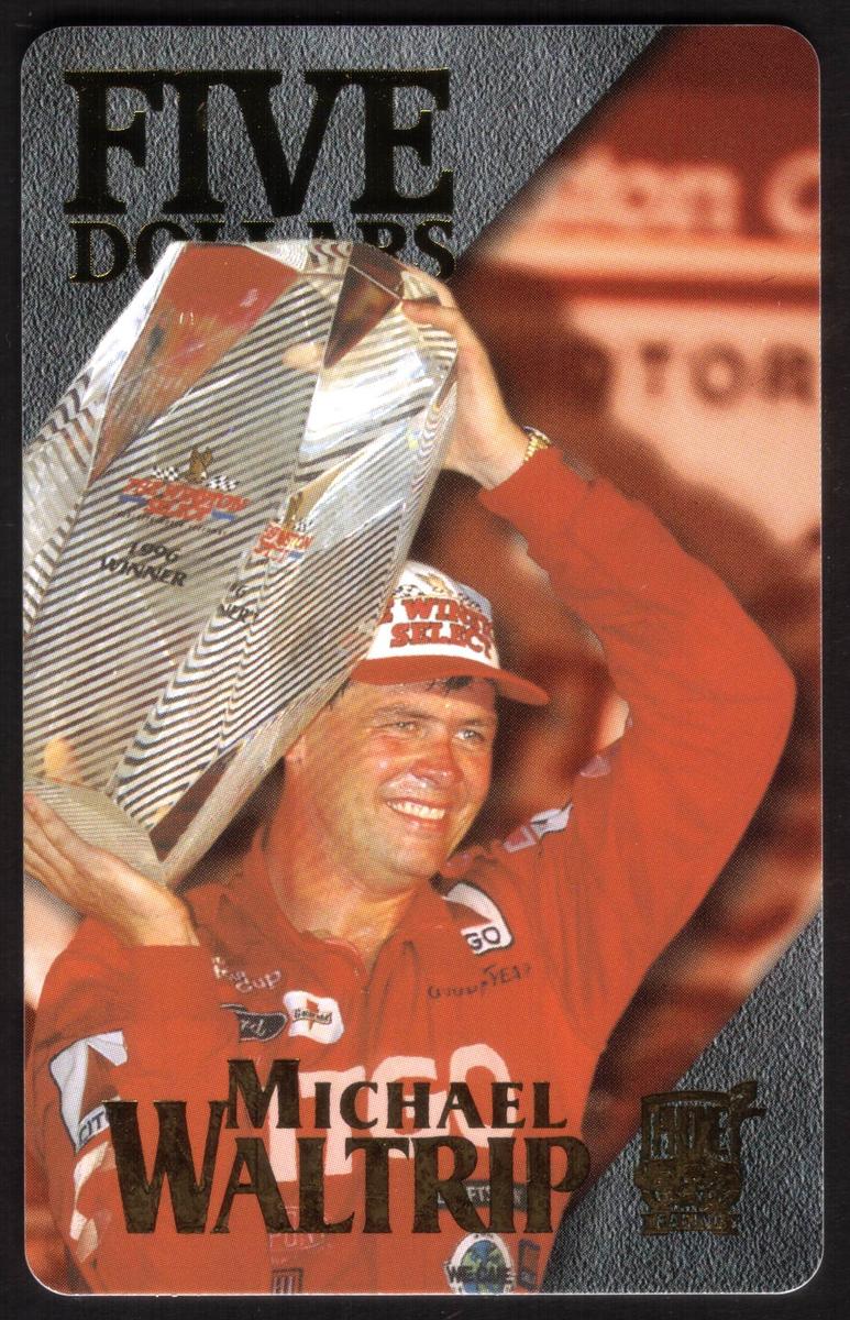 This collectible phone card features a color image of Michael Waltrip celebrating while holding a large, faceted trophy above his head. He is wearing a red racing suit adorned with sponsor logos and a white and red Citgo cap. Michael Waltrip’s name is prominently displayed in bold black letters at the bottom of the card. The top left corner shows the value of the card with the text "FIVE DOLLARS" in large black letters.