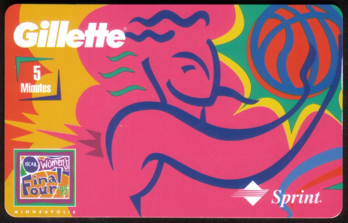 The card prominently displays the logos and trademarks of the National Collegiate Athletic Association (NCAA) and Gillette, linking the product to sports promotion, specifically basketball. The NCAA logo is visible alongside basketball imagery, underscoring the basketball theme connected with the college sports league. The presence of the Gillette brand indicates a promotional collaboration for the year 1995.