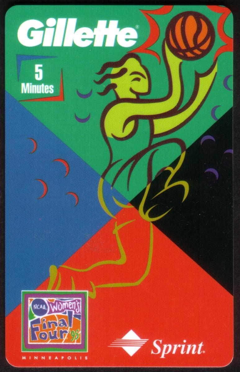 Overall, the card visually celebrates women’s NCAA basketball through branded logos and a vibrant composite of sports imagery. It reflects the 1995 promotional efforts by Gillette involving NCAA basketball, with a focus on capturing athleticism and competitive spirit in basketball through its design and trademarks.