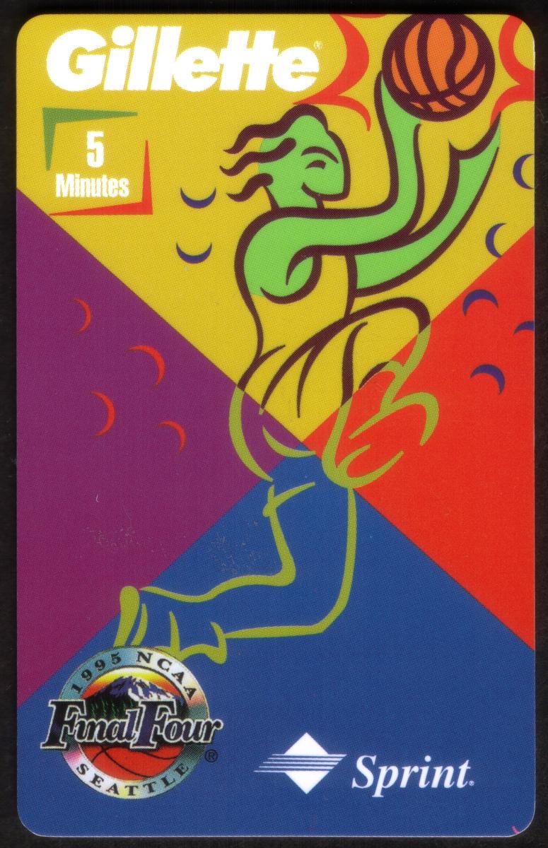 This card is part of a promotional release tied to NCAA basketball and Gillette’s sponsorship or marketing efforts during that time. It captures the energy of the sport with vibrant graphics and logos that underscore its official association with NCAA basketball events. Sprint is also mentioned, linking the card to that brand or promotion.