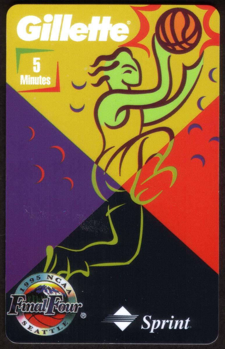 This card is a collectible promo associated with NCAA basketball and Gillette’s marketing efforts in 1995, representing the intersection of sports, branding, and artistic design in the realm of basketball memorabilia. The design highlights the cultural significance of NCAA basketball through strong visual branding and thematic colors.