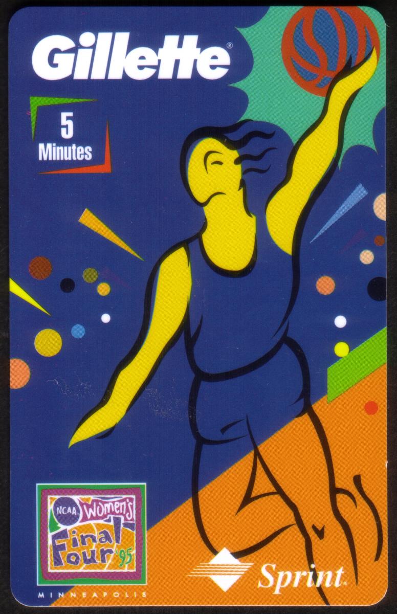 Vibrant 1990s NCAA Final Four phone card featuring stylized female basketball athlete, Gillette and Sprint logos, bold colors, and dynamic athletic imagery. |