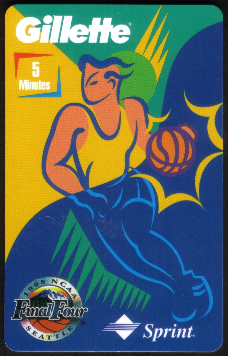 The card’s theme revolves around NCAA basketball, integrating licensed NCAA logos and trademarks. The visual style is modern and athletic, with the emphasis on basketball culture as reflected through official branding and promotional tie-ins from 1995. The color palette and design elements collectively highlight the sport and its association with Gillette and Sprint.