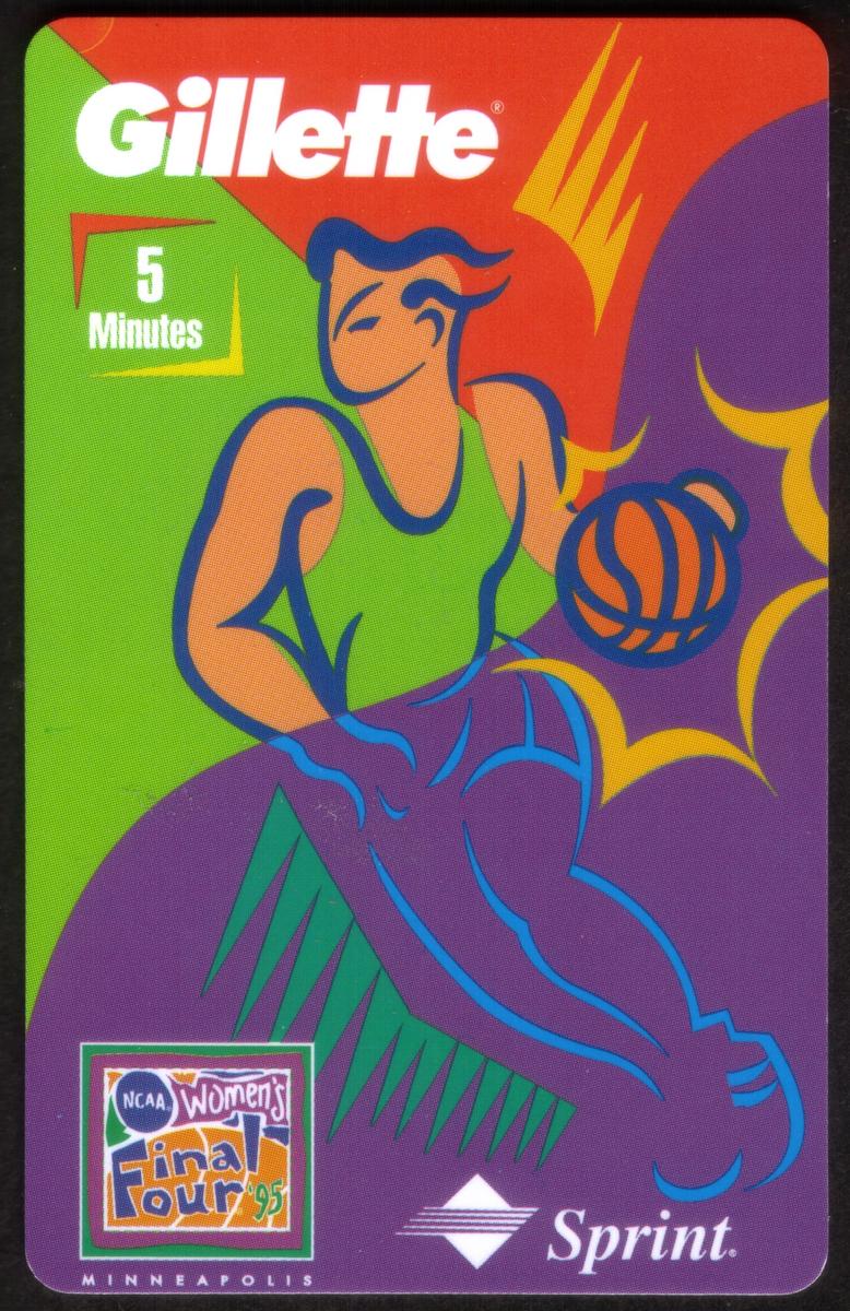 The card also references Gillette and the year 1995 with the text "Gillette NCAA Gillette 1995" clearly visible. The header shows a red band at the top with the words "Surfer Drive" included. Additionally, the card includes identifiers such as "Women's SD:CW (889)" and "Sprint," which are printed on the surface. The overall composition integrates promotional branding with collegiate basketball imagery, highlighting NCAA basketball through official logos and stylistic design choices associated with the Gillette promotion.