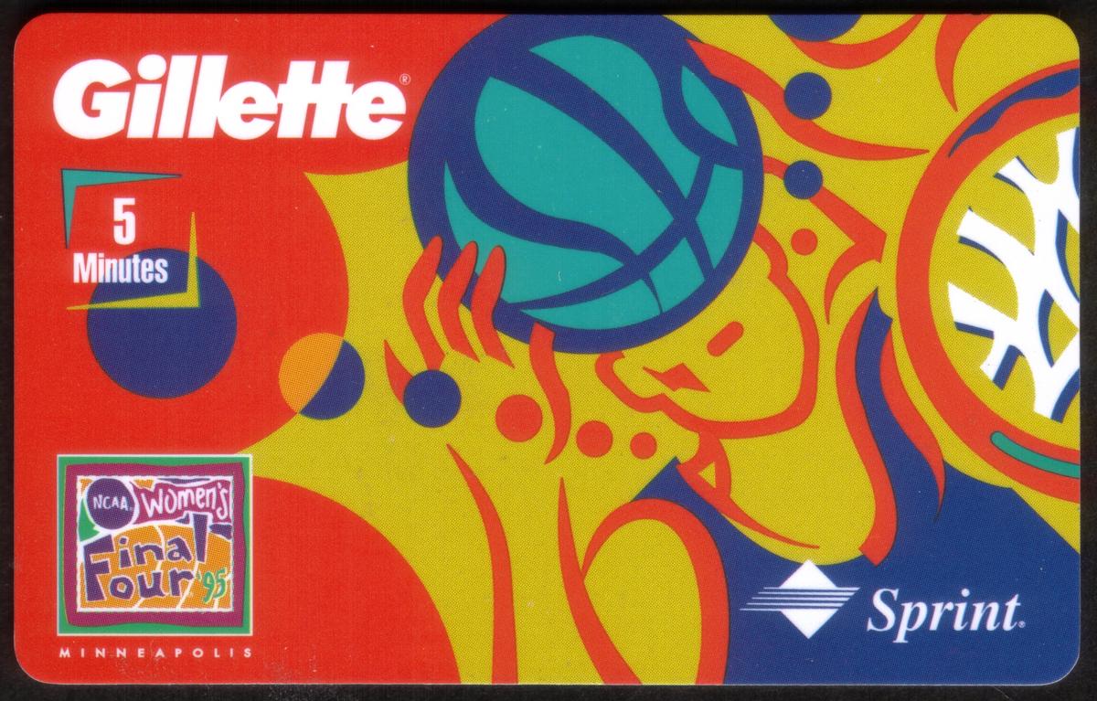 Prominently displayed on the card are logos and trademarks linked to the NCAA and Gillette. The text includes “Gillette NCAA Gillette 1995” and “Torso Dunk (Red at Left),” along with abbreviations such as “Women’s TD:DW (876) - Sprint,” which may refer to the series or edition details. The design integrates various basketball elements, including subtle basketball graphics and curved lines that create a sense of motion, reinforcing the basketball theme.