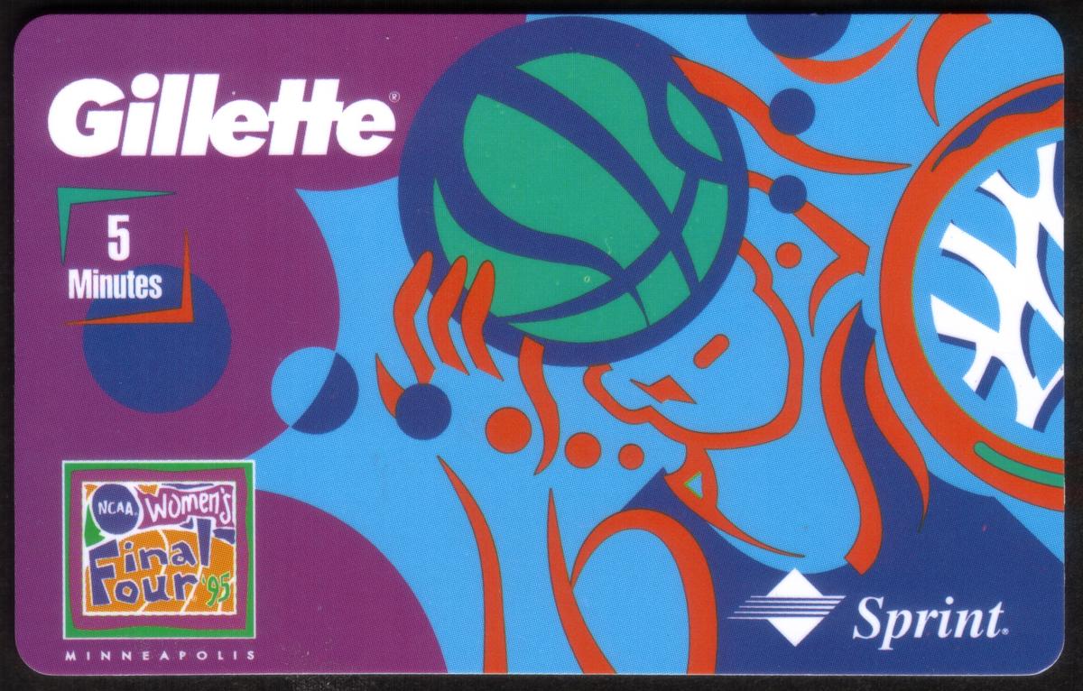 This card combines sports iconography with promotional branding related to the 1995 NCAA basketball events and Gillette’s sponsorship. The overall design showcases logos, trademarks, and artistic interpretation that celebrate basketball, making it a focused piece for collectors interested in NCAA sports memorabilia and promotional items from that year.