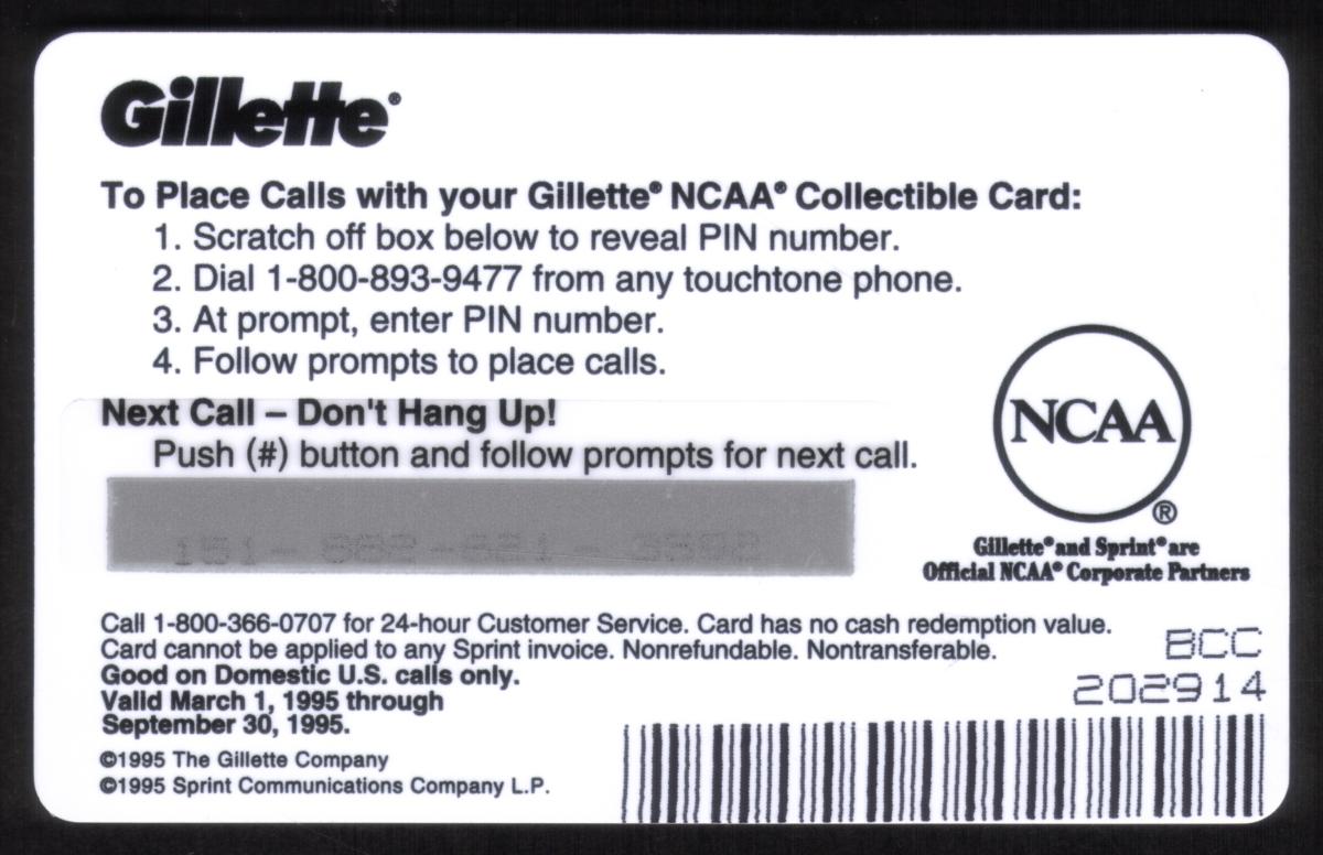 This Gillette Sprint promotional phone card celebrates the National Collegiate Athletic Association (NCAA) basketball event, specifically the 1995 Final Four held in Seattle. It combines trademarks and logos of Gillette, NCAA, and Sprint with bold abstract graphics reflecting the sport of basketball.