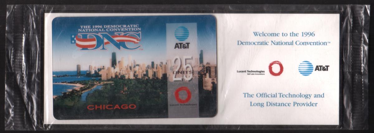 1996 Democratic National Convention in Chicago, featuring city skyline, DNC logo, AT&T branding, and 25-unit value, celebrating political history and communication. |