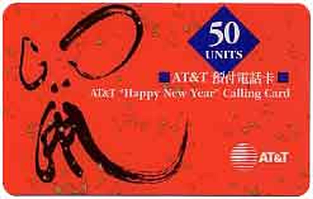 This collectible phone card from AT&T dated 1996 commemorates Chinese New Year. The front of the card features artistic designs inspired by the holiday and Chinese culture. Prominently displayed is the text "AT&T Happy New Year Calling Card" along with "1996" and "Chinese New Year." The design includes bright red and gold colors, traditional hues symbolizing luck and prosperity in Chinese celebrations.