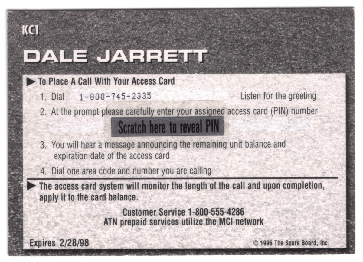Dale Jarrett NASCAR phone card featuring his portrait in branded racing suit, sponsor logos, $5 value, and collectible racing memorabilia design. |