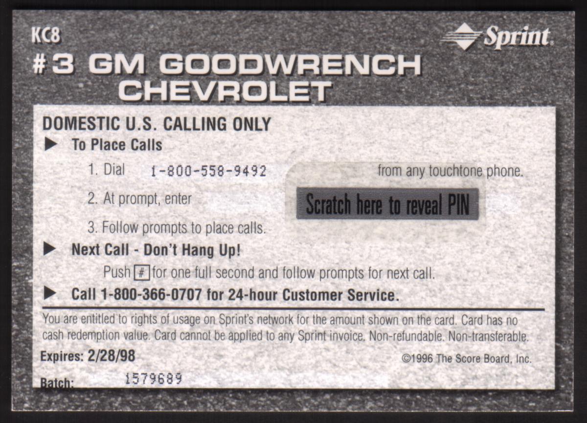 | $5. 1996 'AUTOgraphed Racing' KC8 (Trading Card Size) #3 GM Chevy Car |