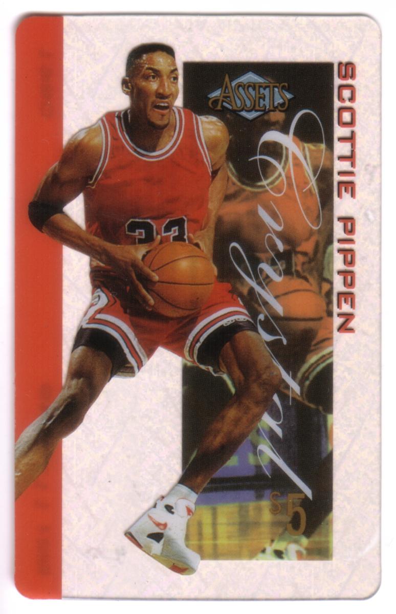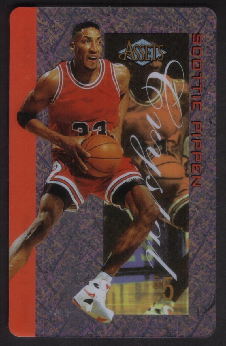 The card is titled "Assets '96" and is issued by The Score Board Inc. It is designated as Card #6 of 10 in this particular series. The right side of the card displays the name "Scottie Pippen" in vertical red text. The word "Assets" appears near the top center in a decorative font, and a white signature of Scottie Pippen overlays part of the card's design, reinforcing its collectible value.