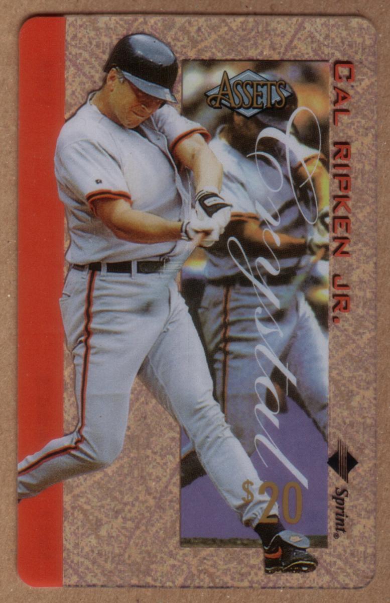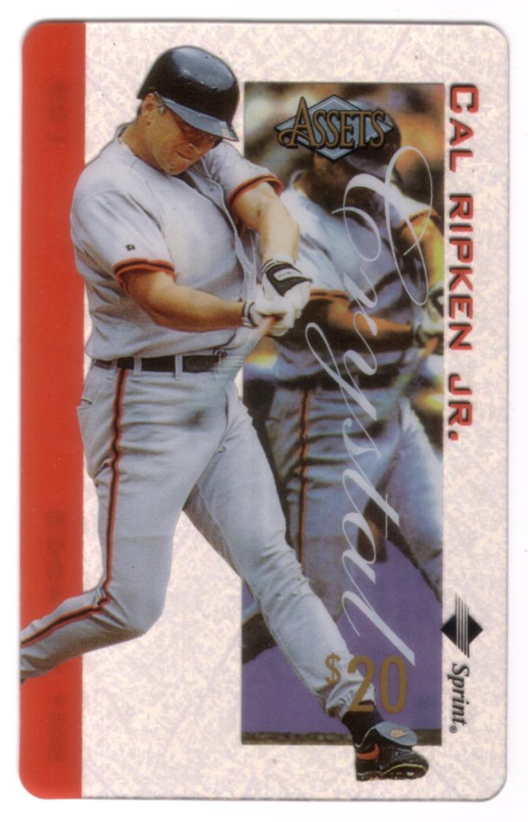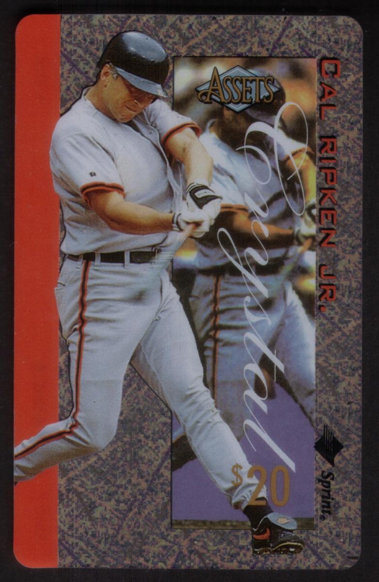 The card is labeled "Assets '96" and is marked with a $20 denomination. The word "Assets" appears near the top, with the signature-style script "Cal Ripken Jr." running vertically along the right side in bold red letters. The Sprint logo is positioned near the lower right corner, indicating sponsorship or branding.