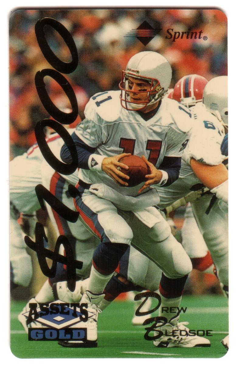The card includes several printed details indicating its theme and origin. The top right corner features the Sprint logo, indicating a promotional association. Large black text reading "$1000" is vertically positioned on the left side of the card. At the bottom left, the logo and text "ASSETS GOLD" appear, underscoring the card’s series and value level. To the bottom right, Drew Bledsoe’s name is clearly printed in stylized text with "Drew Bledsoe" in black, reinforcing the identity of the player featured.
