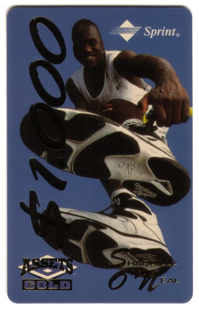 The card includes the title "Shaq Assets Gold" and prominently displays the denomination value "$1000" in gold lettering. The branding of The Score Board Inc. is visible on the card, indicating the manufacturer. The National Basketball Association (NBA) logo appears on the card, reaffirming its official basketball and NBA theme. The overall design emphasizes basketball, with clear references to the sport and Shaquille O’Neal’s legacy as an NBA player.