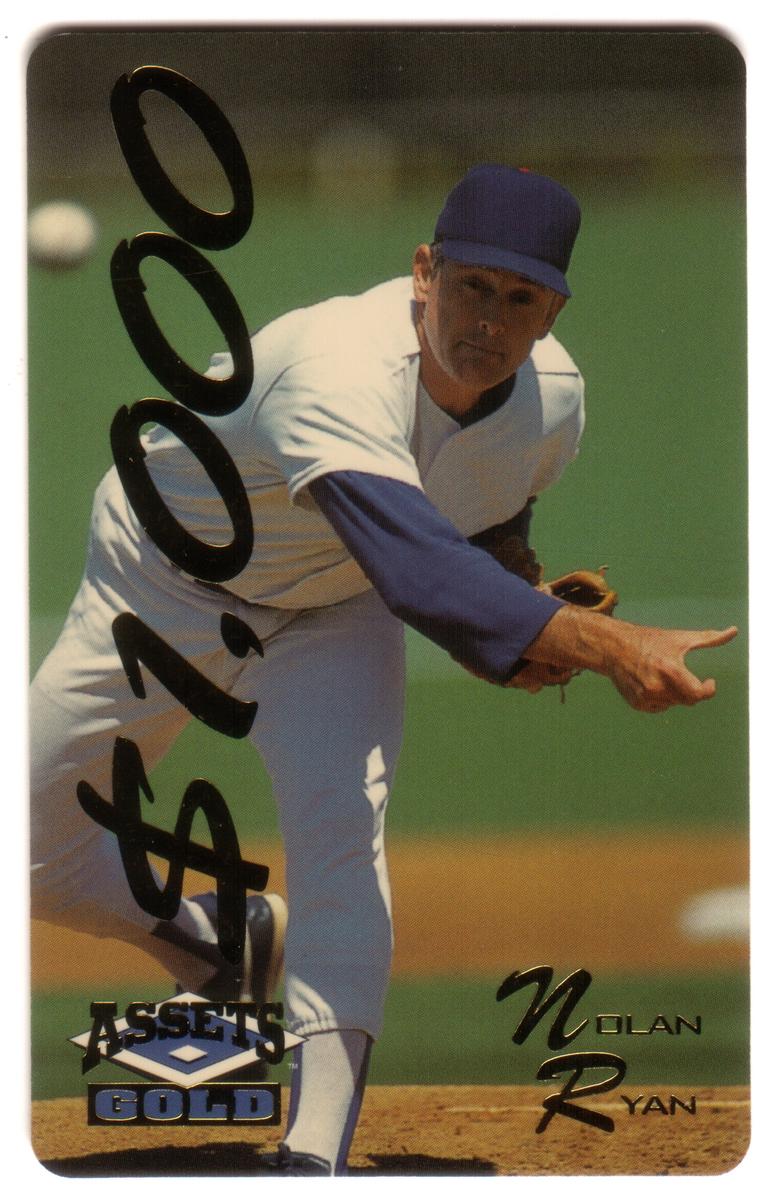 This collectible phone card features a prominent image of Nolan Ryan, the legendary Major League Baseball pitcher. Nolan Ryan is depicted in his baseball uniform, positioned in a pitching stance, holding a baseball bat. The card highlights key baseball elements such as a bat and baseballs around the image, emphasizing the sport. The color scheme incorporates gold accents that reflect the card’s $1000 denomination, lending an elegant and valuable appearance.