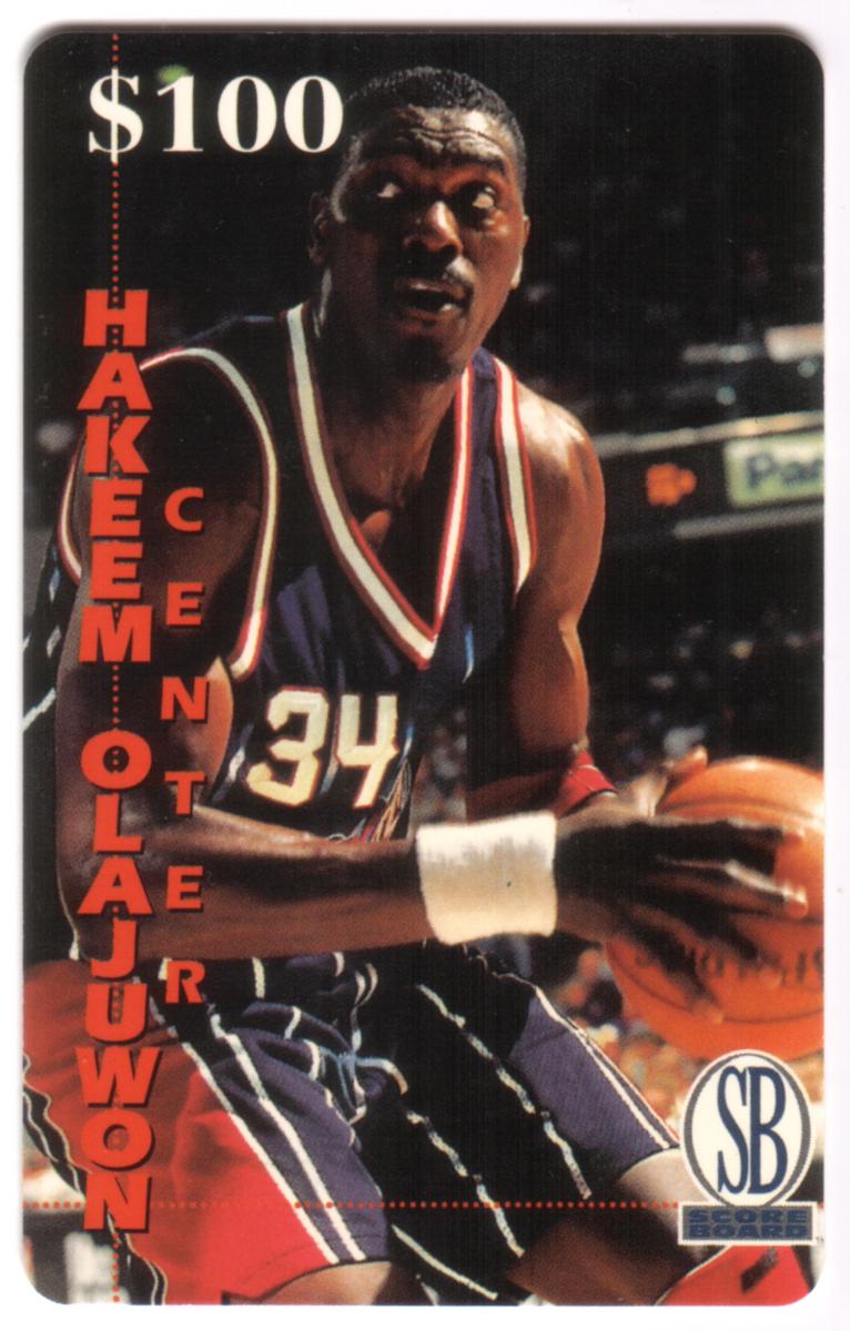 This collectible card features Hakeem Olajuwon, a basketball center, wearing a dark basketball uniform with the number 34 on the front. The card has a value of $100 printed at the top left corner. The name "HAKEEM OLAJUWON" is printed vertically in bold red letters along the left side of the card, with the word "CENTER" arranged vertically beside it in the same font. At the bottom right corner is the "SB SCORE" logo in a blue and white circle.