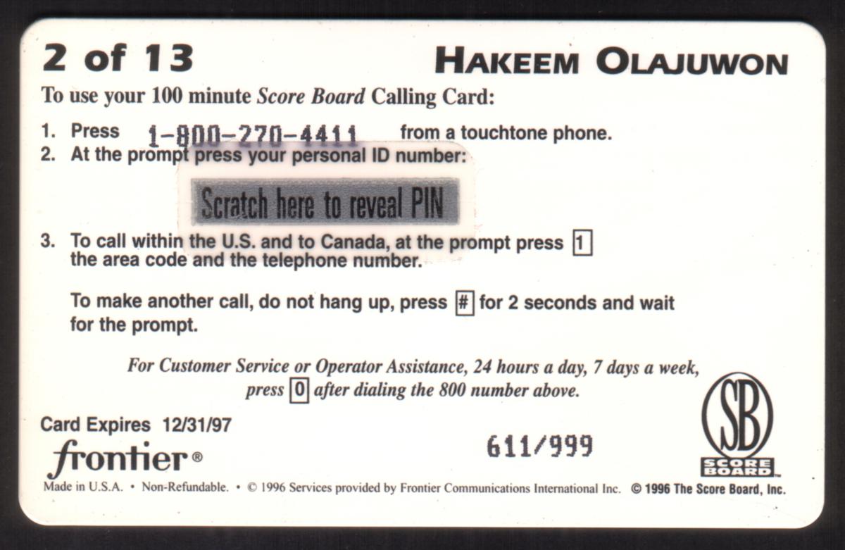 This is a Sports collectible card related to the NBA, emphasizing Hakeem Olajuwon's status as a Most Valuable Player (MVP) basketball player. The card is marked with an expiration date of 12/31/97 and has a monetary denomination of frontier $100.