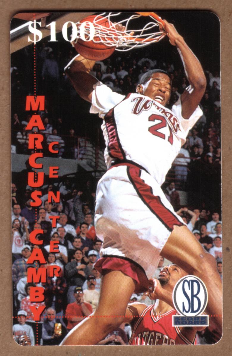 The card’s value is marked as $100 in the top left corner. To the lower right, there is a circular logo with the letters “SB” above the word "Scoreboard," which indicates the card’s issuer or series. Along the left side of the card, Marcus Camby's name is vertically printed in bold red letters, with "Marcus Camby" on the left and "Center" on the right. The background reveals a crowded arena with spectators watching the game and an opponent from the Rutgers team positioned beneath the basket.