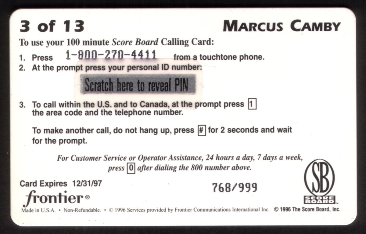 This card is from a basketball series associated with the NBA and the National Basketball Association, specifically highlighting Marcus Camby as a prominent center. It is numbered 3 of 13 and includes an expiration date noted as 12/31/97. The card belongs to The Score Board collection and represents a valuable collectible for basketball fans and card collectors.
