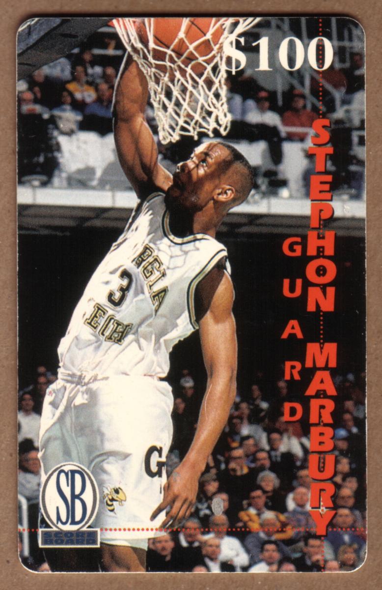This collectible card features NBA basketball guard Stephon Marbury in action, wearing a white basketball uniform with "Georgia Tech" emblazoned on the front, indicating his collegiate team. Marbury is shown mid-air, executing a dunk with the basketball firmly in his right hand, about to score through the hoop. The crowd is visible in the background, seated in an indoor basketball arena, highlighting a live game setting.