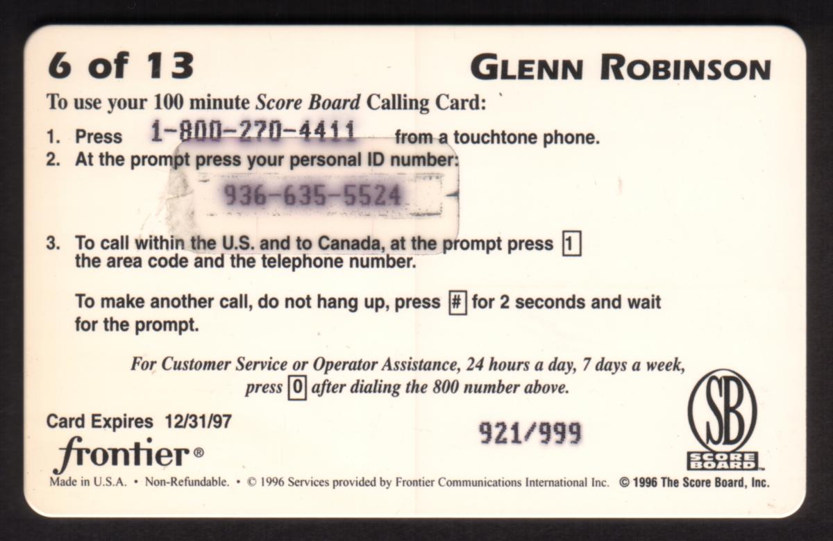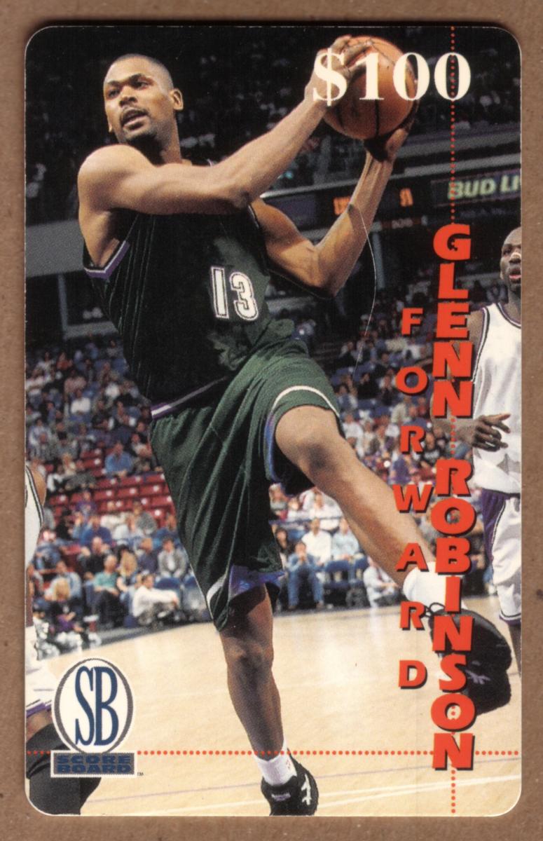 The overall presentation highlights Glenn Robinson's role as a key player in basketball, specifically within the NBA. The card is issued by The Score Board and is marked as USED. The combination of detailed imagery and clear textual information makes it a valuable collectible for basketball enthusiasts and card collectors alike.