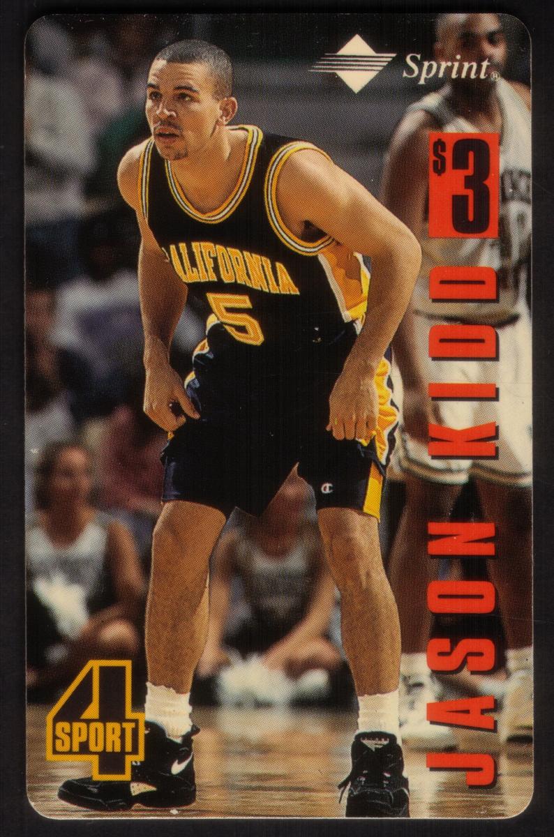 This collectible phone card features Jason Kidd in his California Golden Bears basketball uniform, wearing jersey number 5. The image captures Kidd in a defensive stance during a basketball game, showing him focused and ready on the court. The card prominently showcases the Sprint logo in the top right corner.