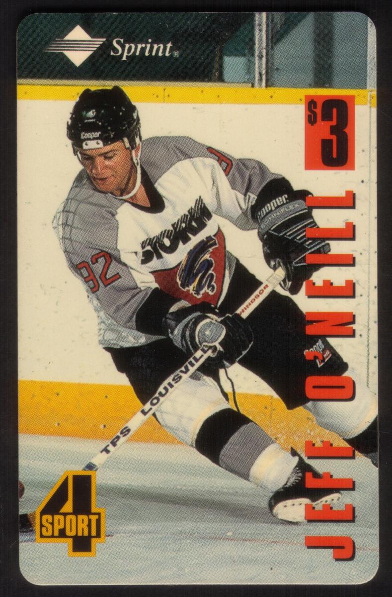Jeff O'Neill's name runs vertically along the right side in bold orange letters with a "$3" denomination prominently shown nearby. The bottom left corner has the "4 Sport" series logo, signifying this card is part of the 4-Sport Series featuring Jeff O'Neill in hockey. The image background shows the rink with a yellow dasher board and clear ice beneath him, highlighting the dynamic moment during gameplay.