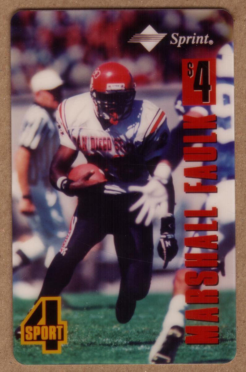 This collectible chip card features Marshall Faulk, a prominent figure in American football, as indicated by the focus on the "4-Sport Series" centered around football. Marshall Faulk is depicted in action wearing a blue and gold NFL uniform, including a helmet that matches the color scheme of his jersey, highlighting his identity as a football player. The card clearly represents the National Football League (NFL) and emphasizes football as the sport.