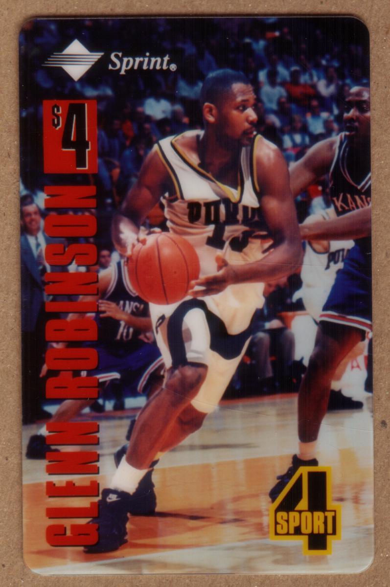 This collectible phone card features an action photograph of Glenn Robinson, a basketball player for the Purdue University team, wearing the team's white and black uniform with "PURDUE" visible across the chest. Robinson is dribbling a basketball with his right hand, looking intently to his left as he maneuvers past an opponent from the University of Kansas, identifiable by the blue and red uniform with "KANSAS" lettering partially visible. The image is taken during a basketball game on a hardwood court, capturing the dynamic motion and competitive intensity of the sport.