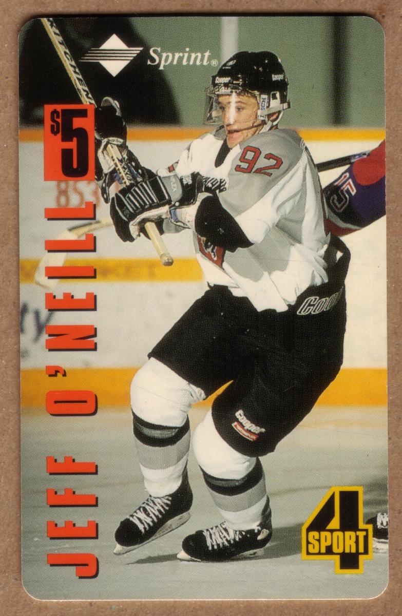 This collectible phone card features hockey player Jeff O'Neill in action on the ice, wearing a white jersey with the number 92 on the sleeves and black hockey pants. He is equipped with full hockey gear including gloves, a helmet with a clear visor, and black skates. O'Neill is holding a hockey stick as he moves forward during a game, with part of an opposing player visible in the background.