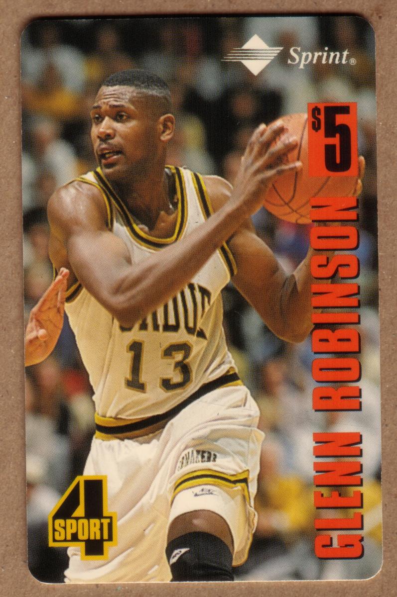 The top right corner displays the Sprint logo, indicating a sponsorship or promotional connection. Below the logo is an orange box with the printed value "$5." Down the right side of the card, in bold orange letters, is the name "GLENN ROBINSON." In the bottom left corner, a yellow and black emblem reads "4 SPORT," which corresponds to the Four Sport Series.