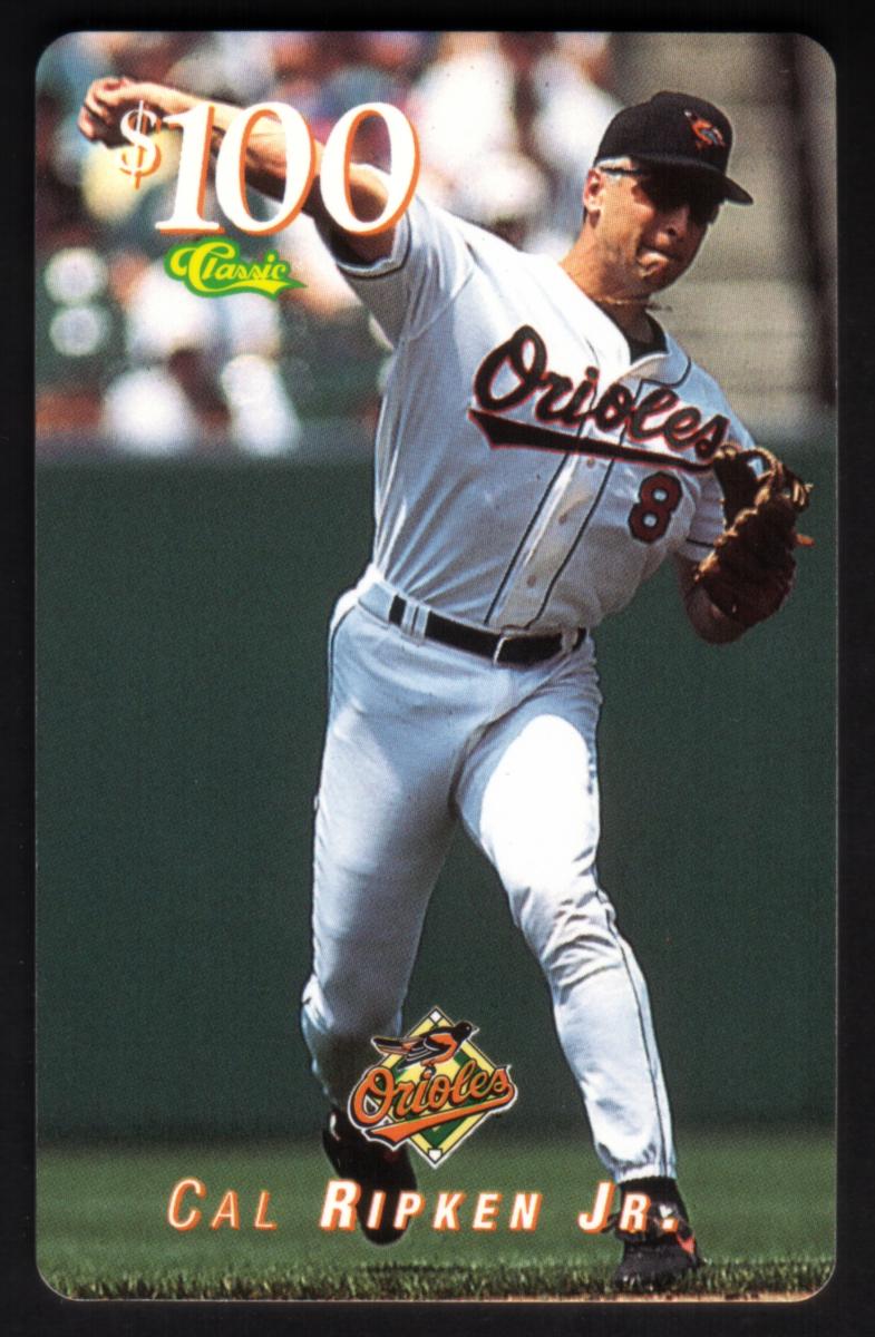 This card is identified as an MCI $100 collectible, part of a series connected to Major League Baseball and baseball players. It highlights Cal Ripken Jr. in his Orioles uniform, emphasizing his role as a premier MLB player during the era around 1997.