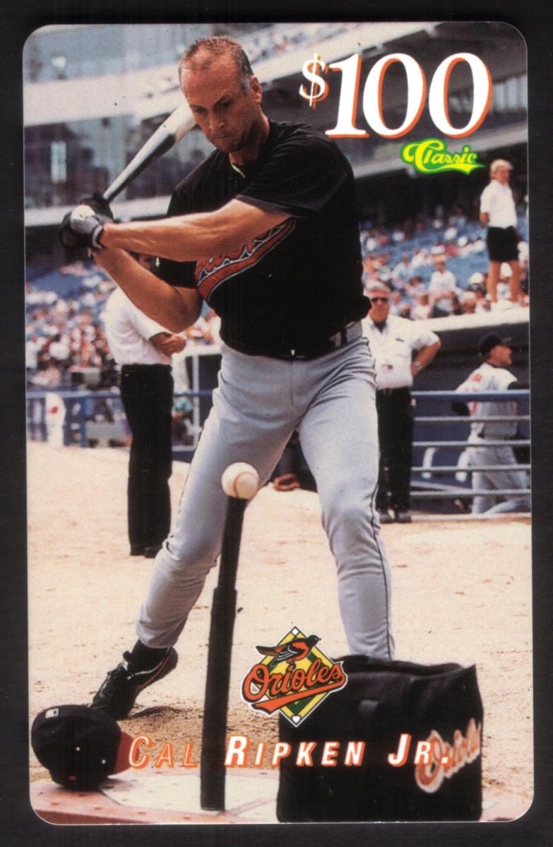 This collectible card features Cal Ripken Jr., a professional Major League Baseball player known for his time with the Baltimore Orioles. The card captures Ripken Jr. during a practice hitting session, wearing the Orioles uniform. The photograph shows him in a batting stance, positioned vertically with a clear focus on the act of hitting. The card prominently displays the MCI logo and branding, indicating its association with the telecommunications company MCI.