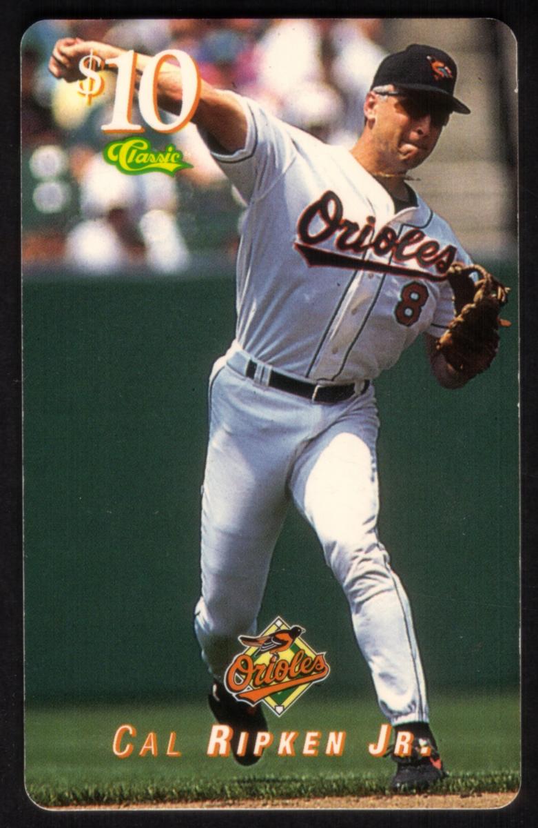 The card has a $10 denomination prominently displayed in the top left corner accompanied by the word "Classic" in green script. Near the bottom, the Baltimore Orioles team logo is situated above Cal Ripken Jr.'s name, which is written in all capital letters in orange with a white outline. The background features an out-of-focus stadium setting, emphasizing the player in the foreground.