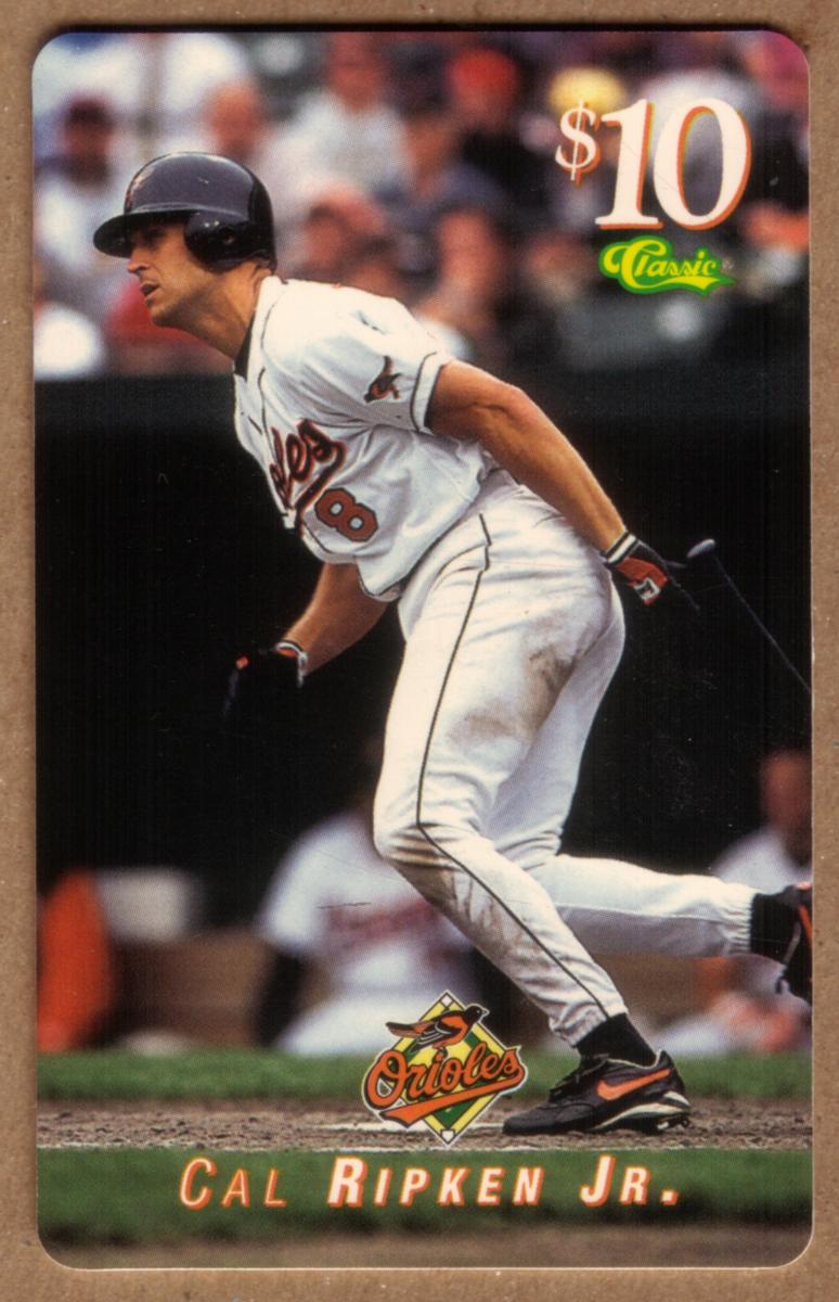 These collectible cards feature Cal Ripken Jr., a legendary Major League Baseball player for the Baltimore Orioles. Each card has a $10 value indicated at the top left corner with the word "Classic" in green below it. The Baltimore Orioles logo appears prominently near the bottom center, above Cal Ripken Jr.’s name, which is written in capital letters with an orange and white coloring. The cards showcase action shots of Cal Ripken Jr. in various baseball settings, all related to the Baltimore Orioles.