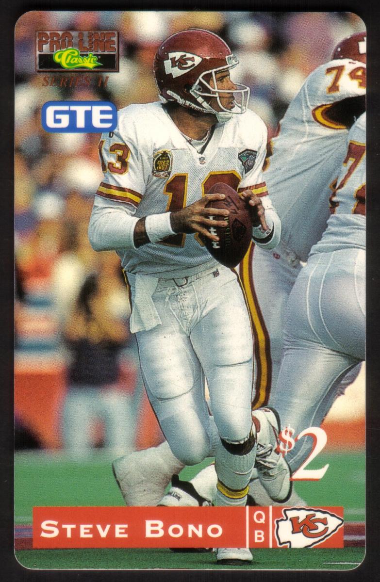 Steve Bono is shown in action or posed in football gear, wearing a uniform with clear colors and details, though there is no helmet number present on the card. The overall card layout emphasizes professional football and the player himself, reflecting the sports collectible nature of this item.