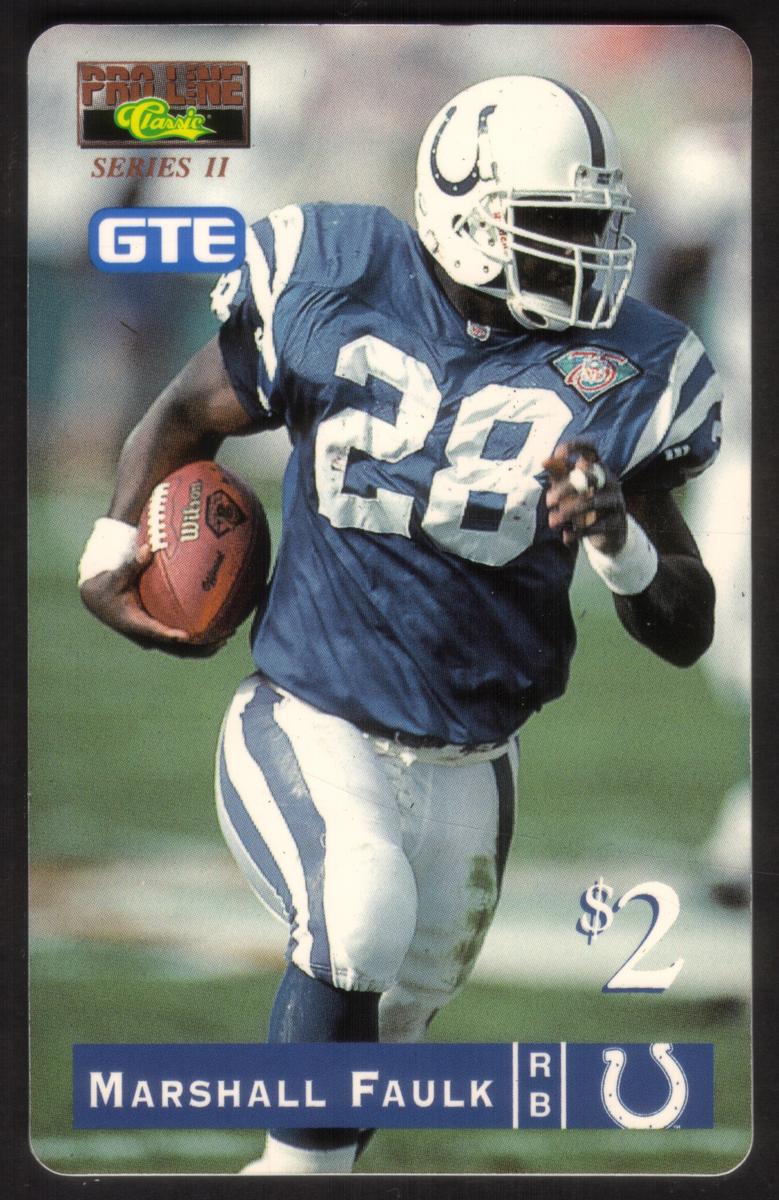 This collectible chip card features NFL player Marshall Faulk in his football uniform. The card shows Marshall Faulk prominently wearing a St. Louis Rams jersey, with the number 28 clearly visible on his front. The image captures Faulk in a poised stance, holding a football with both hands as if preparing to make a play. The Rams team colors of blue, gold, and white are evident in the uniform and helmet design.