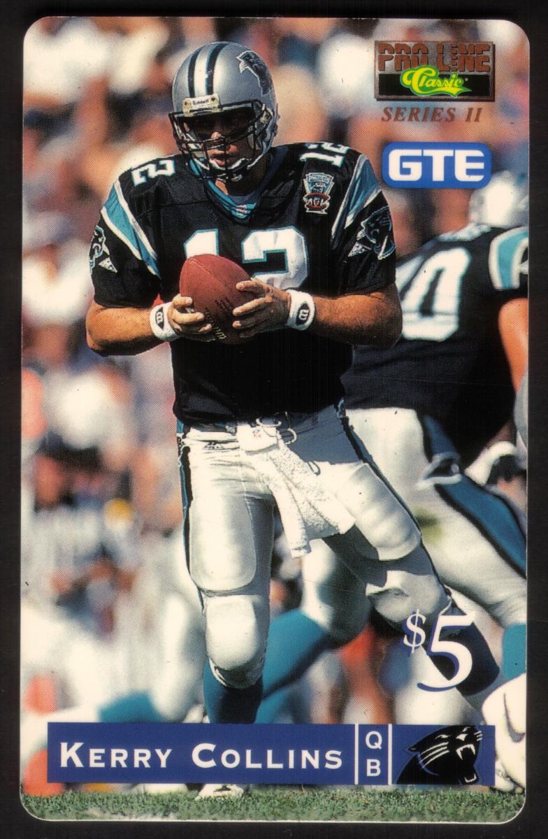 This collectible card features NFL quarterback Kerry Collins, a professional football player, prominently displayed as part of The Score Board (GTE) Proline 2 series. The card is marked as number 8 of 15 in the set. The design includes the official NFL and National Football League logos, reinforcing its association with professional American football. The player’s name, Kerry Collins, is clearly shown on the card, confirming his identity.