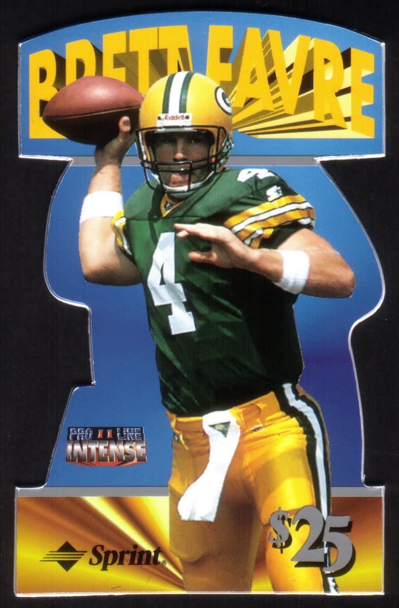 The card prominently displays Brett Favre’s name along the right side, with the “1997 Proline Intense” logo positioned near the bottom. The background blends into dark and light tones, enhancing the focus on Favre’s figure and emphasizing the intensity of the card’s design. The NFL logo and other official branding are visible, confirming its association with the National Football League. The card’s value is noted as $25 in the design, signaling its collectible status.