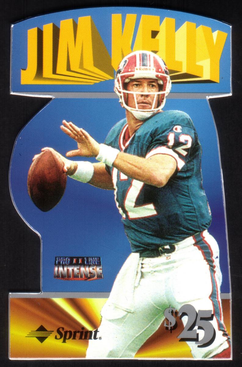 This collectible card features a die-cut design showcasing Jim Kelly, a prominent NFL football player known for his career with the Buffalo Bills. Jim Kelly is wearing his football uniform, which includes a dark-colored helmet, shoulder pads, and jersey. The image captures Kelly in a dynamic pose, holding a football in one hand as if preparing to throw a pass. His uniform is detailed, showing the number 12 on the jersey front, and the overall color scheme includes dark and red tones that reflect the Buffalo Bills team colors.