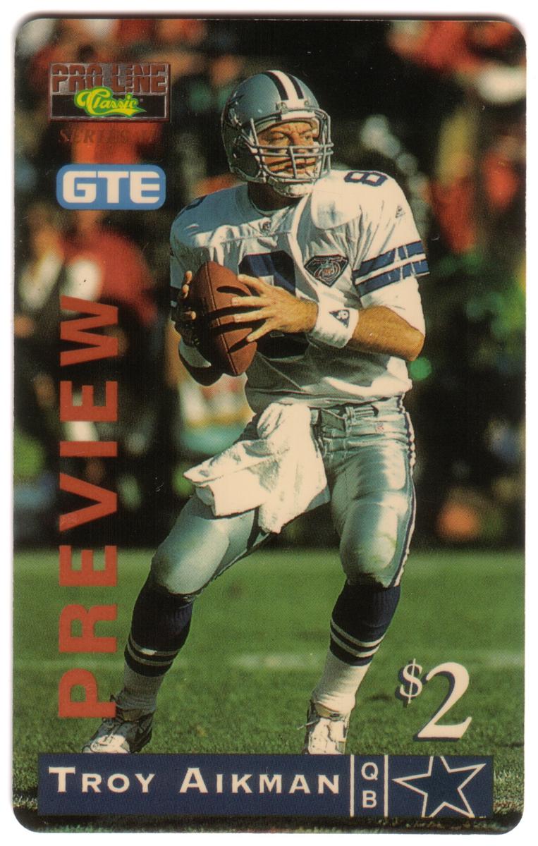 The upper left corner shows the logos for Proline Classic and GTE. On the bottom right, the value of the card is marked as $2. Troy Aikman’s name appears in white capital letters on a blue strip at the bottom of the card, alongside his position, "QB," and the Dallas Cowboys star logo. The image captures a moment from an NFL game, emphasizing the sport of football and the National Football League.