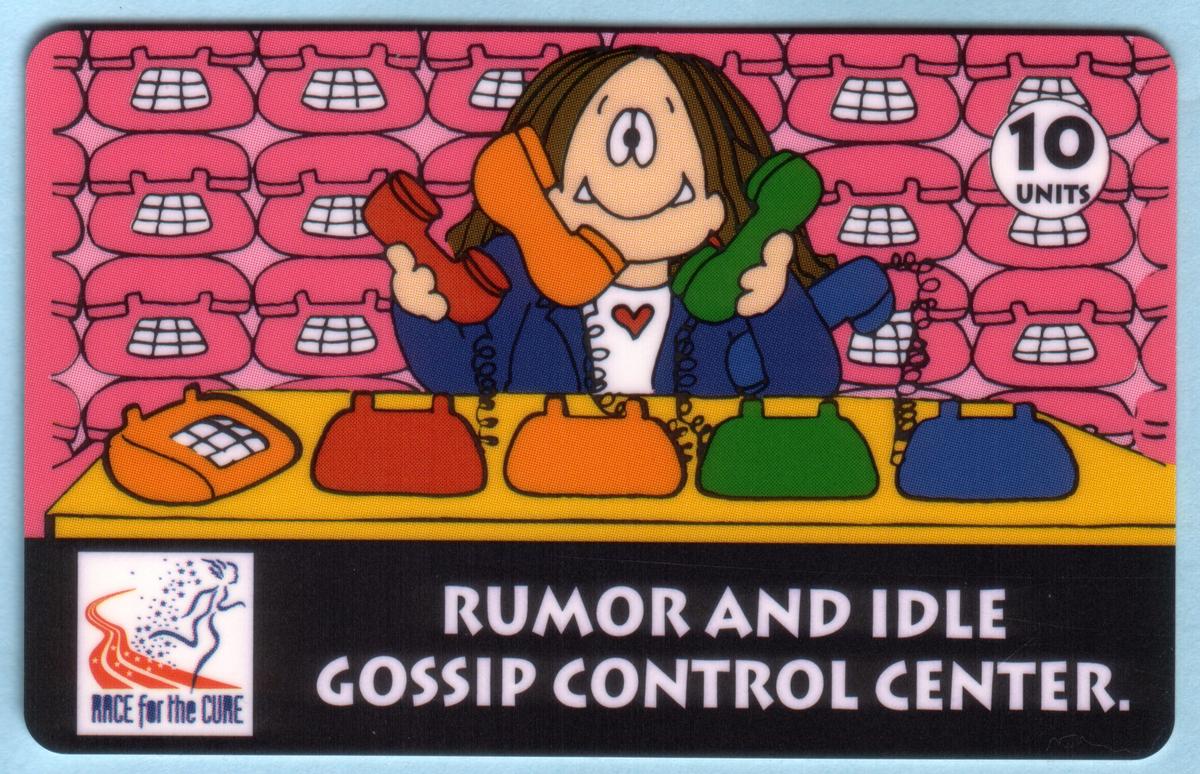 The card includes the title "Rumor & Idle Gossip Control," which ties into the advocacy theme of the Susan G. Komen organization. The artistic presentation uses bold colors and animation-inspired graphics, creating a vibrant and engaging visual effect. The text “Susan G Komen 10u Kathy Comic Breast Cancer Fund” is clearly printed, highlighting the collaboration with the Susan G. Komen Breast Cancer Fund.