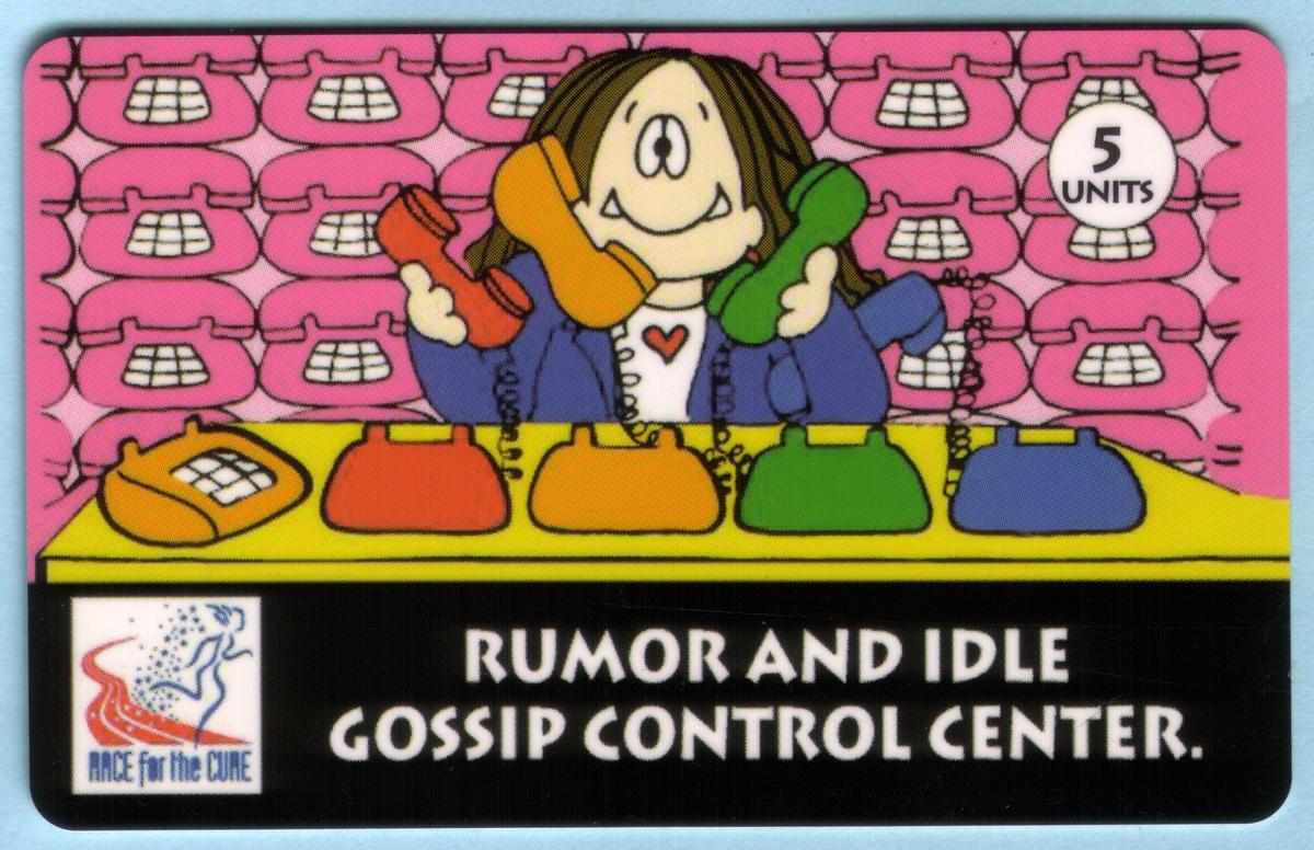 Additional text on the card includes "Rumor & Idle Gossip Control SAMPLE," along with a mention of "USACard Corporation." The overall design combines animation and caricature art styles with thematic elements of telephones and hearts, reinforcing the concept of communication and support in the fight against breast cancer. The card’s face value is marked as 5u, showing its use as a collectible phone card.