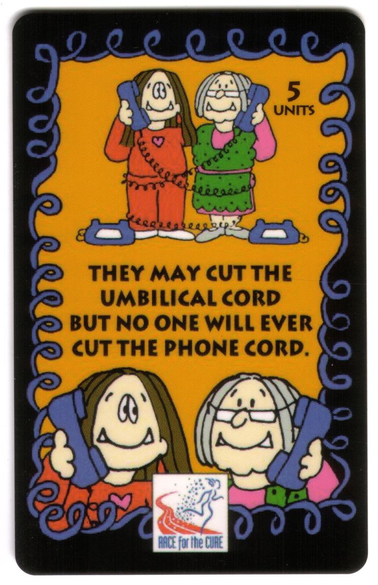 The card prominently displays the name "Kathy Comic" in the lower left corner, indicating the artist responsible for the illustration. The Susan G. Komen Breast Cancer Center is mentioned clearly on the card, along with the value "5U," signifying the card’s worth in units. Additional text on the card includes "Cut The Umbilical Cord SAMPLE" and credits USACard Corporation as the issuer. The overall composition reflects a strong connection to breast cancer fundraising efforts, emphasizing communication and solidarity through the phone and heart imagery.