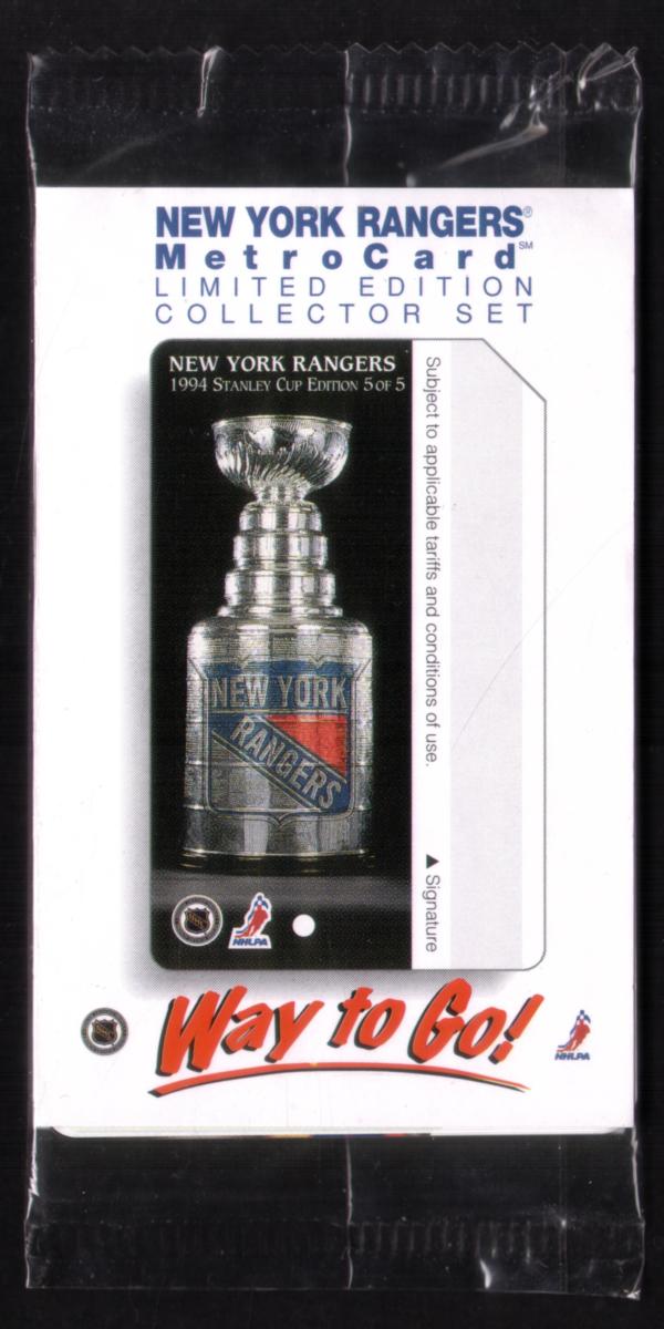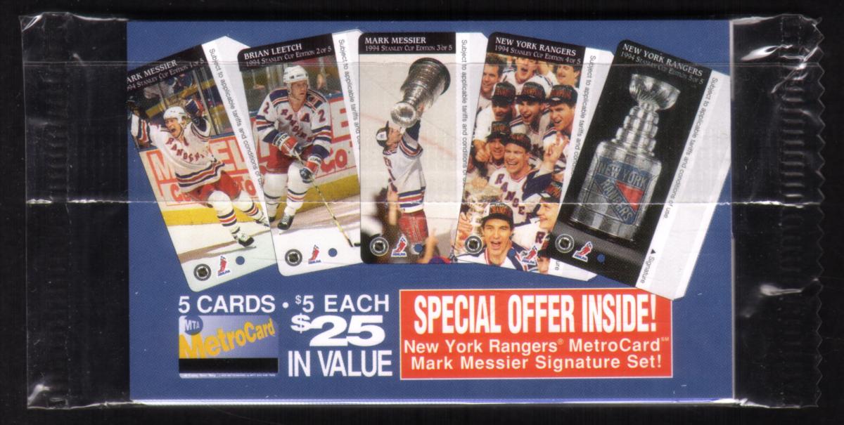 This is a sealed set of five collectible MTA MetroCards issued by the New York City Transit Authority. Each card features themes related to New York City, reflecting the city's transportation system and its cultural and sports landmarks. The set includes notable designs connected to the New York Rangers hockey team, referencing the 1994 Stanley Cup victory. The cards highlight key players Mark Messier and Brian Leetch, whose names and images appear prominently.