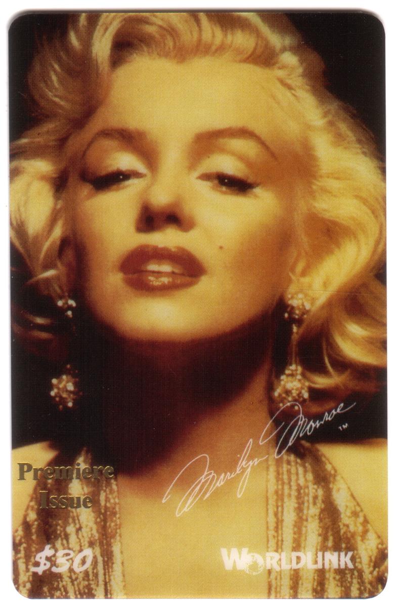 The card is issued by WorldLink Communications and is titled "Premiere Issue," emphasizing Marilyn Monroe’s status as a legendary film star and entertainer. The design includes a predominantly dark background which contrasts with Monroe’s bright complexion, making her the focal point of the card.