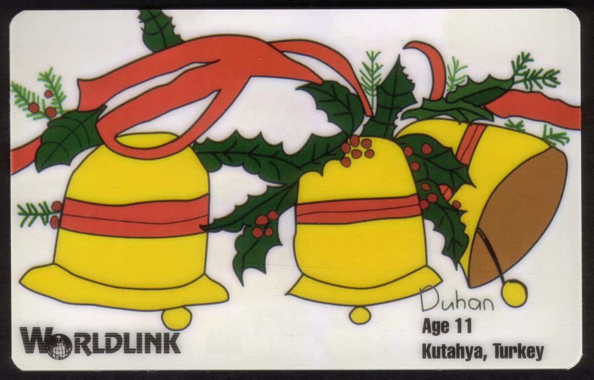 This collectible set features three Christmas-themed cards issued by WorldCom. Each card displays colorful children’s drawings with a holiday motif. The first card shows an angel ornament, depicted with wings and a halo, surrounded by a festive border. The second card features traditional Christmas bells adorned with holly and mistletoe, capturing classic seasonal imagery in bright colors. The third card highlights dogs integrated into a Christmas scene, emphasizing pets as part of the holiday celebration.