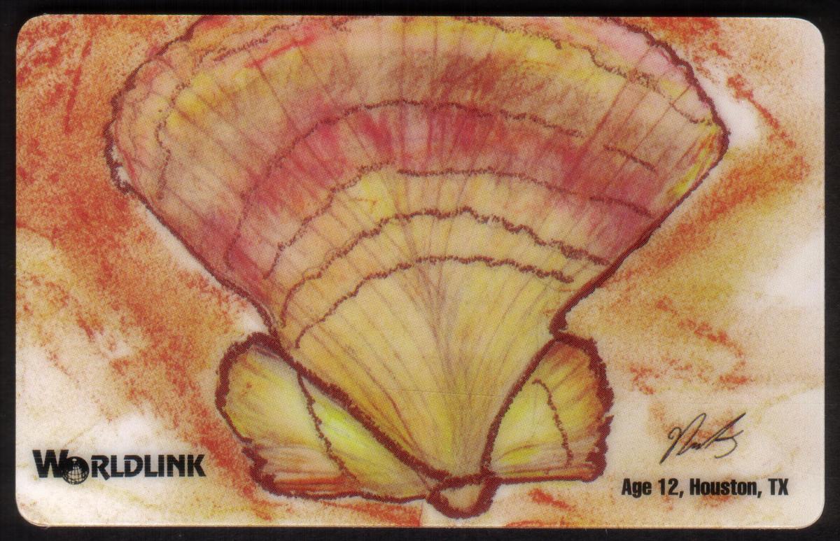 This collectible card features artwork associated with the Children’s Christmas Card Project benefiting the Anderson Cancer Center. The design prominently incorporates a festive holiday theme with Christmas elements, specifically shells, reflecting an artistic connection to a beach environment. The card includes the names "WorldLink Commun." and "Shell," indicating collaboration or sponsorship by these entities.